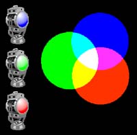 Durch Mischung von Lichtern in den sogenannten Primär- oder Grundfarben Blau, Grün und Rot kann jede andere Farbe erzeugt werden: