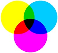 Im Farbstern gegenüber liegen sich die sog. Komplementärfarben, die übereinander projiziert Weiß, übereinander gedruckt (theoretisch) Schwarz ergeben. Zwischen zwei Grundfarben einer Mischart liegt jeweils deren Mischfarbe. Leider sind die heute erhältlichen Druckfarben nicht besonders rein, so daß bei der Mischung dieser realen Farben keine sauberen Mischfarben entstehen. Außer aufwendigen Korrekturen beim Zusammendruck ist als zusätzliche (theoretisch überflüssige) vierte Druckfarbe noch Schwarz notwendig. Für den Druck eines Farbigen Bildes sind daher vier Farbanteile notwendig, man spricht von einem CMYK-Bild (Cyan, Magenta, Yellow, Kontrast = Schwarz) |