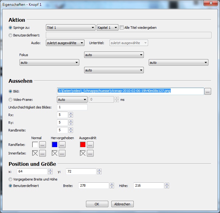 Nach Bestätigen mit OK haben wir unseren Schnappschuss als Hintergrundbild gewählt. Kommen wir jetzt zu den "Buttons", um die einzelnen Filme auszuwählen. Als letztes gehen wir also auf den Punk "Knöpfe". Dort kann man eine Reihe von Symbolen zur Auswahl der Filme wählen. Es ist natürlich auch möglich, Bilder aus den Filmen selbst zu wählen. Bevor wir weitermachen, starten wir also wie oben beschrieben ein zweites Mal den VLC Media Player und lassen den Film bis zum gewünschten Bild laufen. Dann erstellen wir von jedem Film wieder einen Schnappschuss.
