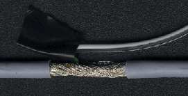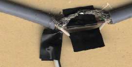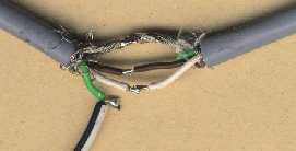 The gentle way would be to carefully remove some (~ 2cm/1 in.) of the outer plastic jacket of the cable, revealing the shielding layer. See pictures of how I did this with some other piece of junk cable, still just for illustration. Next, try to locate the core wires through the shielding and find the one connected to pin #9 of the VGA plug, e.g. piercing the wires' isolation with a pin (I'd start with the red one, if there is any). Cut the correct wire close to the PC side of the gap, so that you can take some of the end leading to the DIN3-socket out of the cable's core and solder it to your +5V supply wire. Isolate carefully with some tape and you should be done.  |