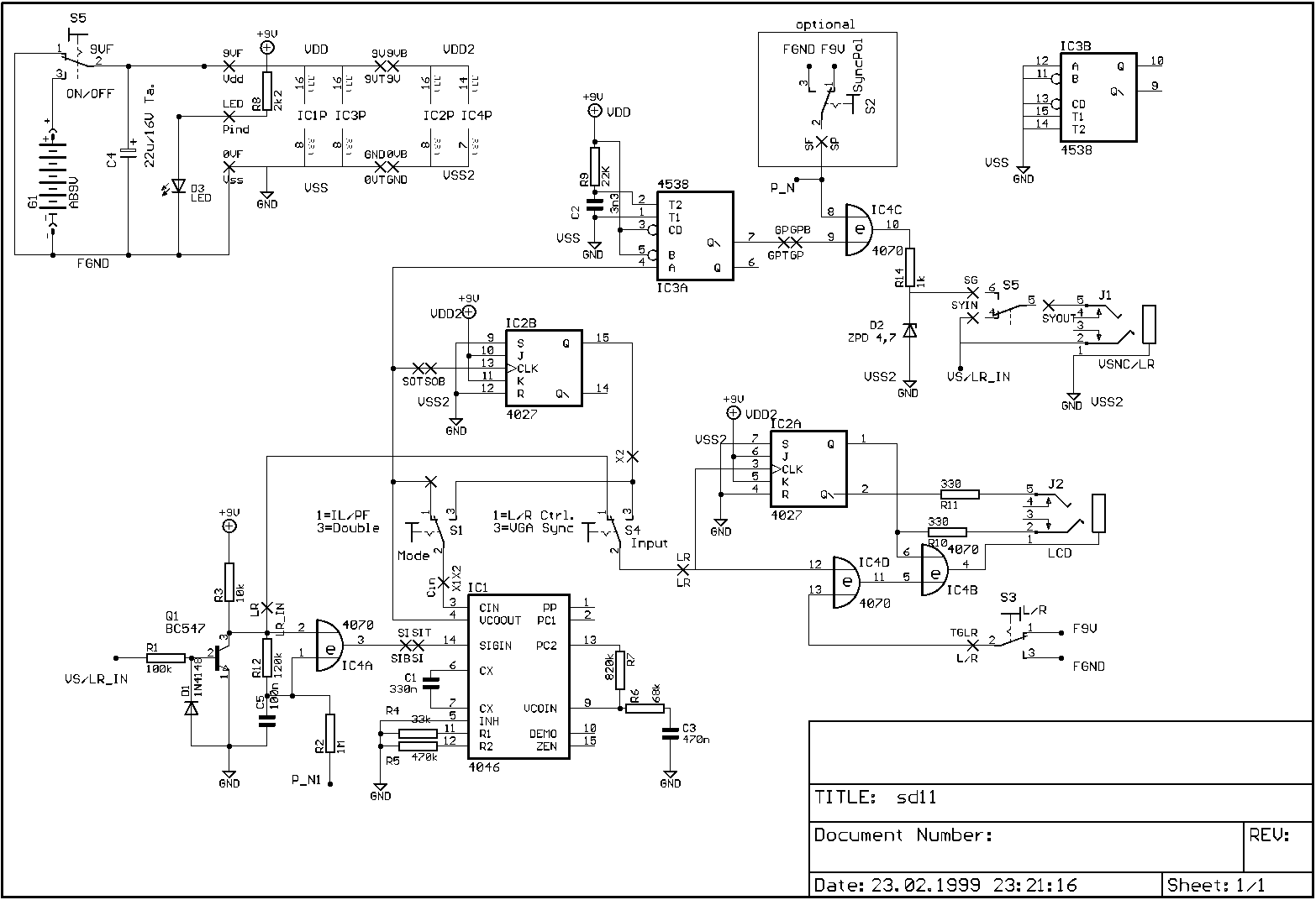 Combines 'the best of both worlds' w.r.t. shutter glasses driving: Like the original Cyberboy controller, I use a (spare from the sync-doubler) flip-flop to get half of the L/R switching frequency to toggle the polarity of the glasses (in contrast to the extra oscillator in the standard 4070-homebrew driver). Unlike the Cyberboy, however, I don't use an additional negative supply voltage, but instead drive the common line for both LCDs reversed to the currently active LCD (as in the standard 4070-homebrew driver).
