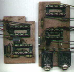 Finally, for now, the two PCBs of Rev 1.0, almost ready to go, except for the ICs and the vertical wires to connect the two boards.