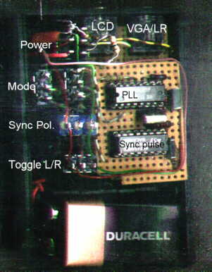 First, pictures of the inside and outside of my first prototype, which is almost identical to the V1.0 PCB design. Not too much to see, I must admit, except that the thing is really packed. The dark reddish spot above 'Power' is the Tantal cap, below 'LCD' you can imagine the extra Z-diode and resitor to clamp the Vsync output to TTL level, which have been added on the V1.1 PCB.
