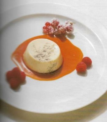 - Sahnecrème gut gekühlt auf Dessertteller stürzen, mit Karamelsirup beträufeln oder mit Früchten garnieren.