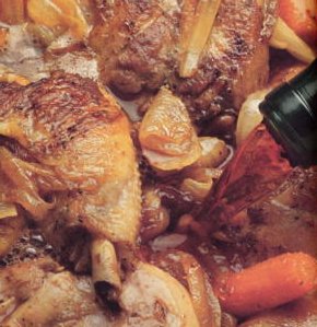 Filetstücke würzen, leicht mit Mehl bestäuben und im Schmortopf in heißen Butterschmalz anbraten. Herausnehmen. Bacon, Schalotten und Möhren anbraten. Hähnchenstücke, Thymian und Lorbeer dazugeben, dann den eingekochten Wein und den Cognac aufgießen. Das Ganze bei geschlossenen Topf und kleiner Hitze 45 Minuten schmoren lassen.