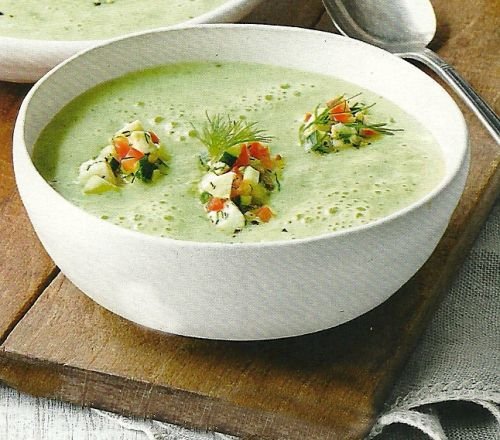 - Lorbeerblatt aus der Suppe entfernen, Frischkäse zugeben und die Suppe fein pürieren. Mit Salz und Pfeffer abschmecken, restlichen Dill unterrühren. Suppe portionsweise mit dem Mozzarella-Tatar anrichten.