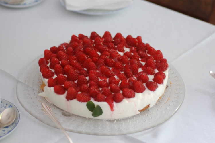 - Creme auf den Biskuitboden streichen, Beeren darauf verteilen. Mindestens 2 Stunden kalt stellen. Fruchtaufstrich durchrühren und mit einem Löffel über die Himbeeren träufeln.