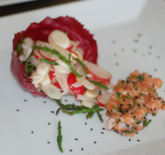 Rohmarinierter Spargel mit Passe Pierre und Lachstatar |