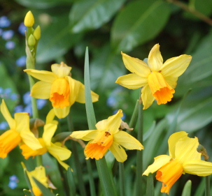 | Zu den größten Arten zählt die in Mitteleuropa nur sehr selten angebaute Italienische Narzisse, die bis zu 80 Zentimeter lange Stängel ausbildet. Die Form der Laubblätter einer Narzisse reicht von linealisch bis riemenförmig. Bei einigen Arten wirken die Laubblätter fast grasartig oder sie sind gar stielrund. Blühstarke Narzissen haben drei, in seltenen Fällen sogar vier Laubblätter. Bei den meisten Arten überragen die Laubblätter im ausgewachsenen Zustand den Blütenstängel. Bei wenigen Arten biegt sich das Laub während der Blüte in Richtung Boden. Am unteren Ende, knapp über dem Boden, werden die Blätter von zwei farblosen Scheidenblättern umfasst. Die Blattfarbe variiert zwischen mittelgrün und blaugrün. Bei im Frühjahr blühenden Narzissen vergilben die Blätter im Hochsommer und sterben ab, sobald die Samenkapseln reif werden. |