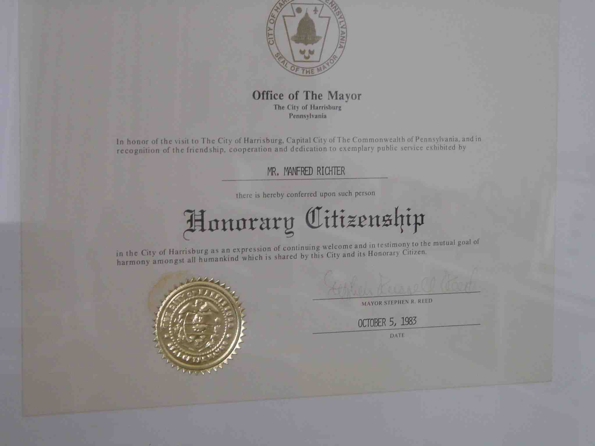 Der Bürgermeister von Baltimore Kurt Schmoke überreicht die Urkunde im Rathaus der Stadt