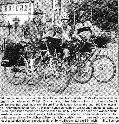 Wer von uns Dreien auf die Idee kam, eine Fahrradtour von Bremerhaven nach Frastanz in Vorarlberg/Österreich zu machen, wissen wir nicht mehr so genau. Wahrscheinlich war es Willi, der ja aus dieser Gegend stammt. Von der ersten Idee bis zur Realisierung vergingen fast zwei Jahre. Wir "Drei" - das sind Volker Beier, 46 Jahre alt und in Idar-Oberstein (Pfalz) wohnhaft, Hans-Gerd Schollmanns, 52 Jahre alt und Wilhelm Zimmermann, 49 Jahre alt - beide in Bremerhaven zuhause. Man besorgte sich Karten, die nötige Ausrüstung wurde so nach und nach angeschafft. Als dann Volker bei uns oben zu Besuch war, nahmen wir die Gelegenheit wahr und planten schon mal die Fahrtroute anhand der Karten und einem Gerät, mit dem wir die Distanzen ermitteln konnten. Eine Tabelle kreiste von Zeit zu Zeit per E-Mail zwischen uns, wo wir die benötigte Ausrüstung festhielten, sodaß nach Möglichkeit keine doppelten Gegenstände mitgenommen wurden. Wir fahren oft mit dem Fahrrad. Volker fährt wann immer er Zeit und Gelegenheit hat, mit seinem Rennrad durch den Hunsrück. Hans-Gerd und ich fahren täglich mit dem Fahrrad zum Dienst, sodaß wir beide monatlich so ca. 500 km abstrampeln. So ging es dann am 1. Mai 2002 bei windigem und regnerischem Wetter los. Nachfolgend eine kurze Beschreibung der Tour.
